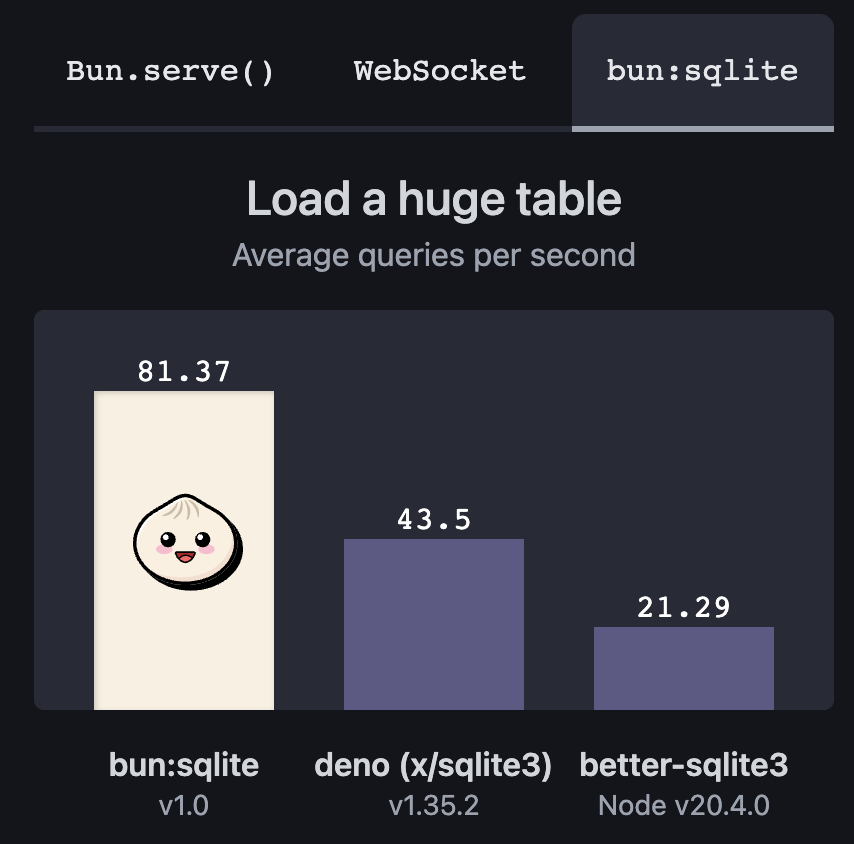 To give you an idea of how fast we’re talking about: The bun:sqlite module benchmarks show that it is roughly 3-6x faster than better-sqlite3 and 8-9x faster than deno.land/x/sqlite for read queries.